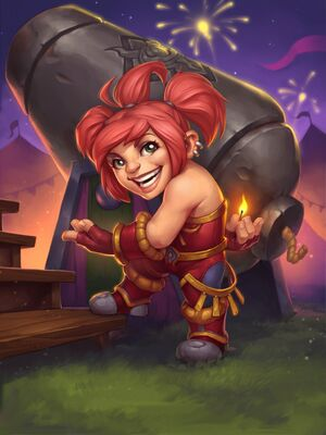 Maxima Blastenheimer is one of the inhabitants of Darkmoon Faire, operating the Blastenheimer 5000 Ultra Cannon as one of the Faire's performers. The "Humanoid Cannonball" minigame involved has Maxima launch adventurers into the air, and they would then have to utilize a makeshift parachute to land on a target in the boardwalk. Her summon line, "step right up to get blown up!" is taken from one of her possible quotes in World of Warcraft.